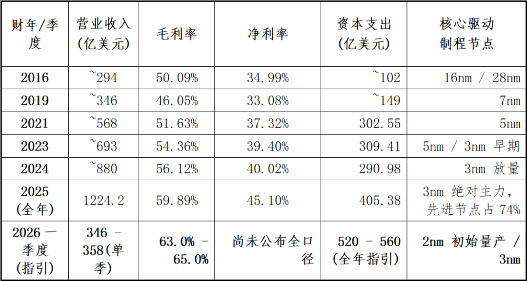 表2:台积电(TSMC)核心盈利指标与资本开支演进(2016-2026)