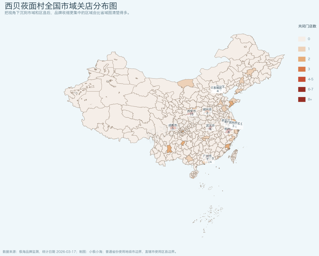 再看关店分布,问题就更不像“普通收缩”了。公开报道里,西贝计划关闭102家门店,北京、上海、深圳、广州、杭州都排在前面。极海样本里的存量关闭分布也沿着同一条线走:北京、上海依旧是关店最集中的区域,而深圳、西安这样的高成本城市同样承压。换句话说,被修剪的不是边角料,而是原本最核心的门店带。