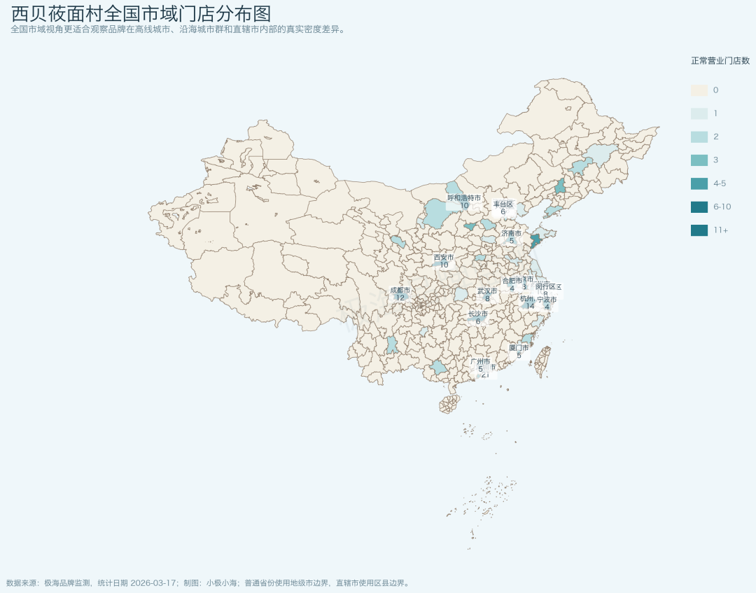 再看空间分布,这套高成本网络的轮廓就更清楚了。门店最密集的省级市场集中在北京市、上海市、广东省、江苏省、浙江省;门店最多的城市则主要是北京市、上海市、深圳市、西安市、杭州市、成都市。这些地方过去是西贝最像样的资产包,现在却也最容易变成高固定成本的包袱。密度高,意味着离消费者近;也意味着离房租、竞争者和经营波动更近。