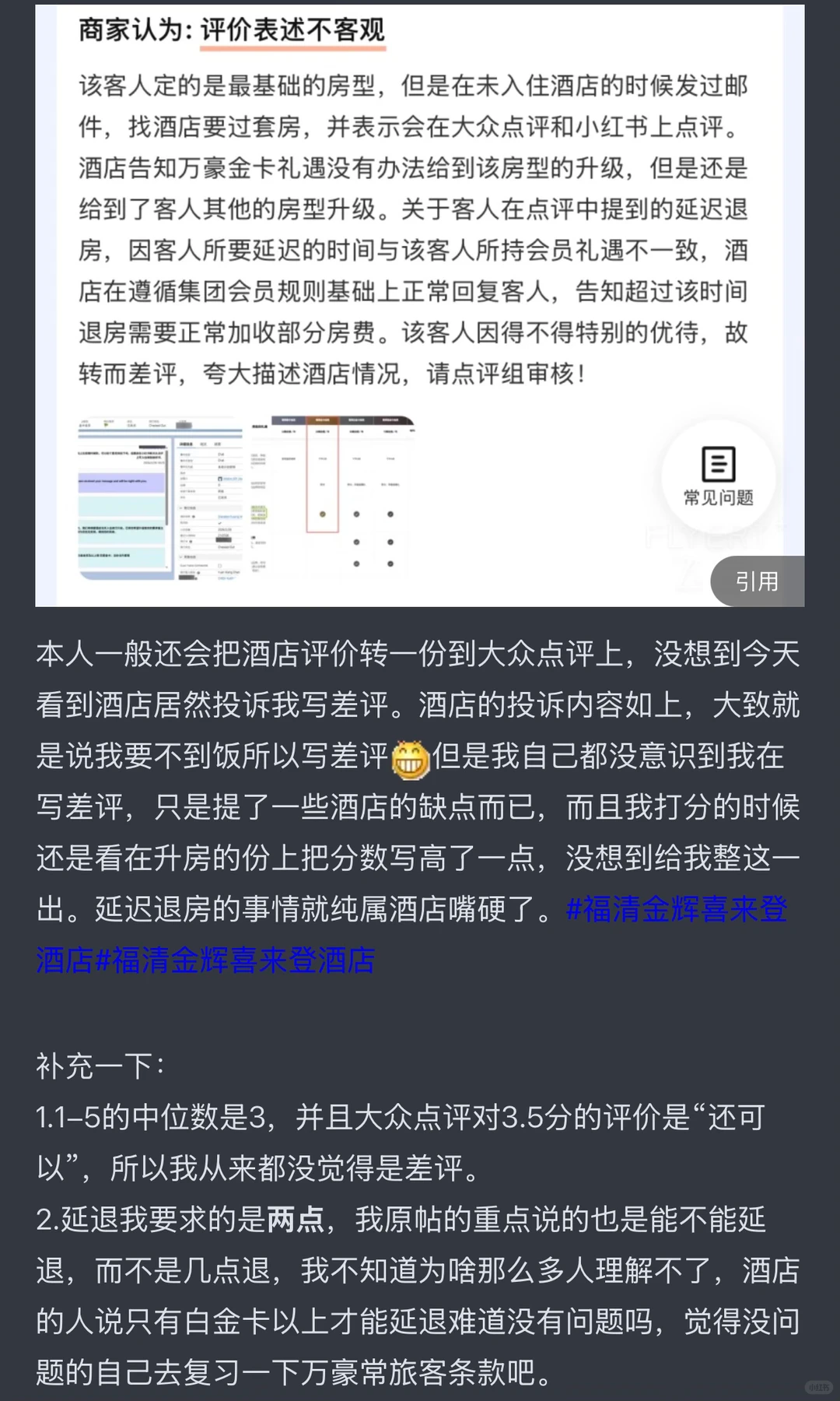 说万豪阴阳她“要不到饭就写差评”。而且3.5分是中位数,大众点评都说了这叫“还可以”,我怎么就成差评了?
