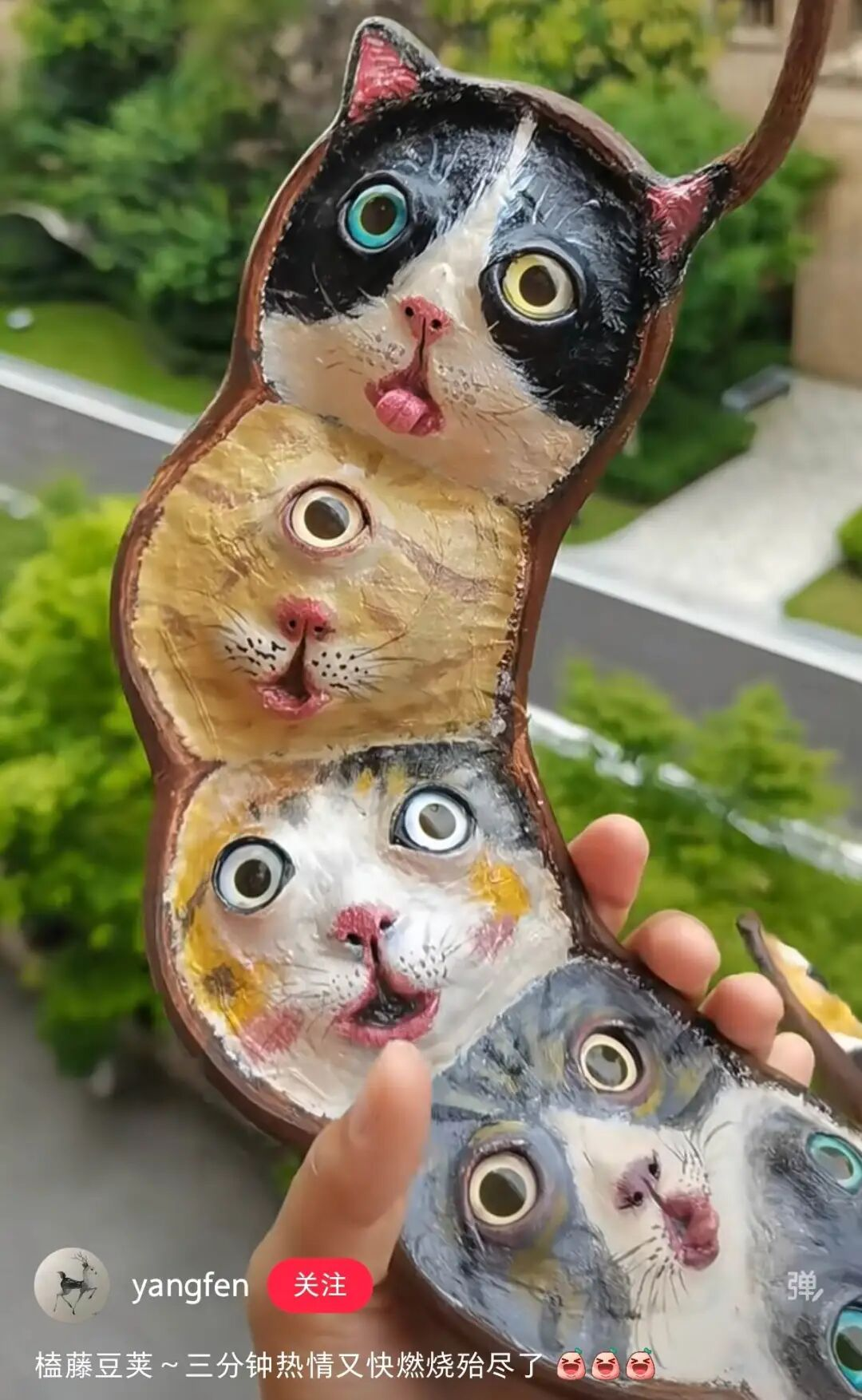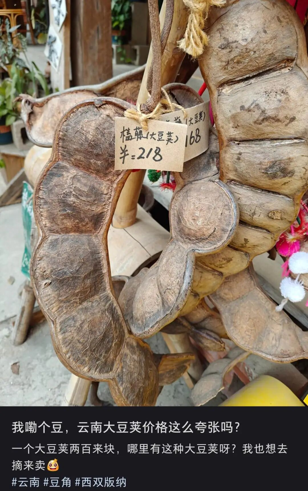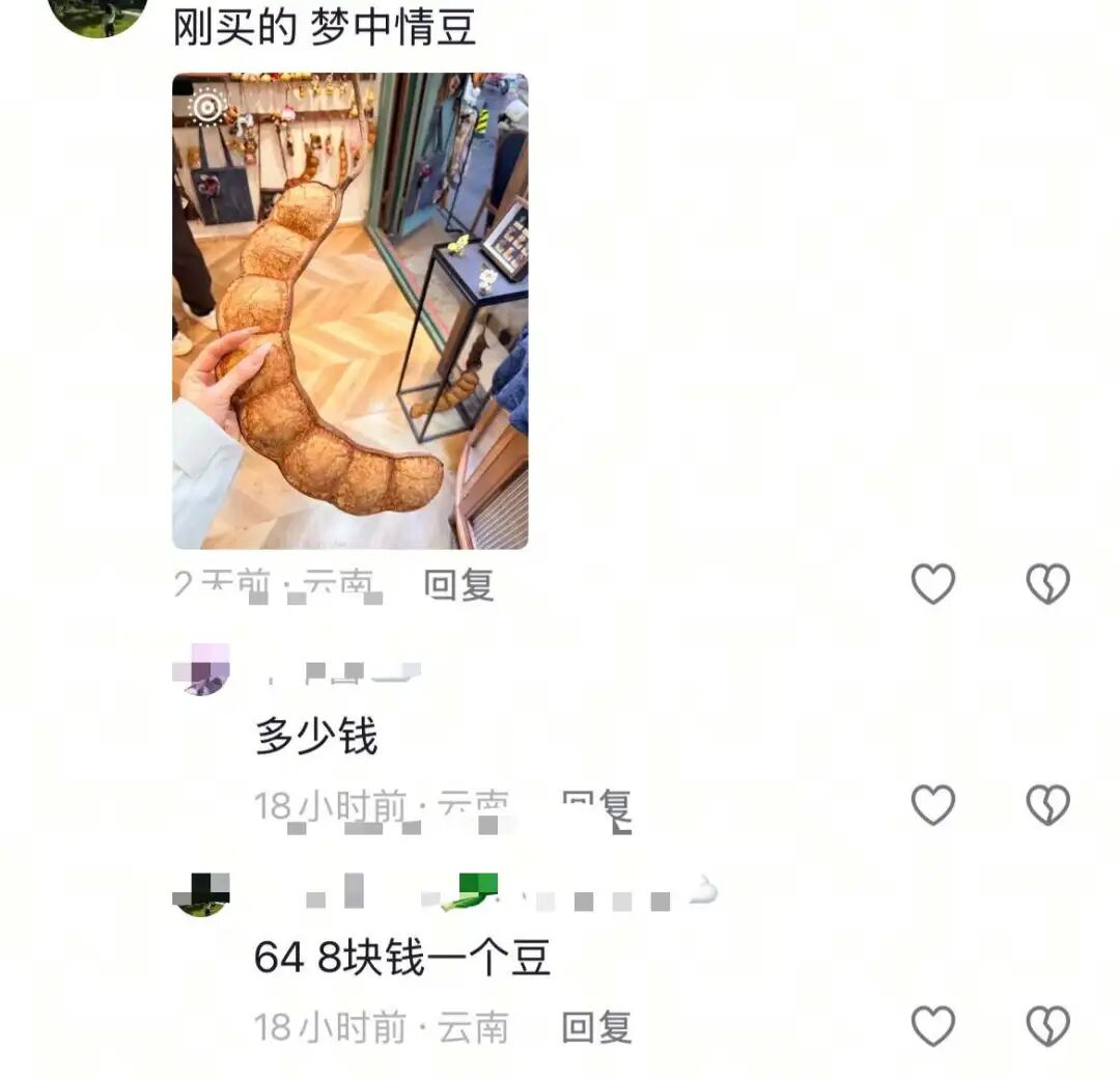 “在机场看到一个人背着个豆荚,比行李箱还显眼。”“我同事从云南回来,办公室里多了一根1米长的豆荚,老板看了都愣住。”还有人晒出自己的DIY成果,把豆荚做成娃娃、挂上铃铛、涂上颜色,每一个都独一无二。