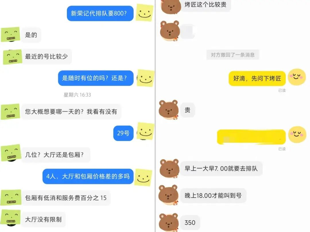 比如深圳的荣轩,有商家代排队费用高达800元。这位商家告诉内参君,排队这些餐厅,他们也需要提前支付成本。“号是提前交付了店里的定金,大厅1000元,包厢2000元。”