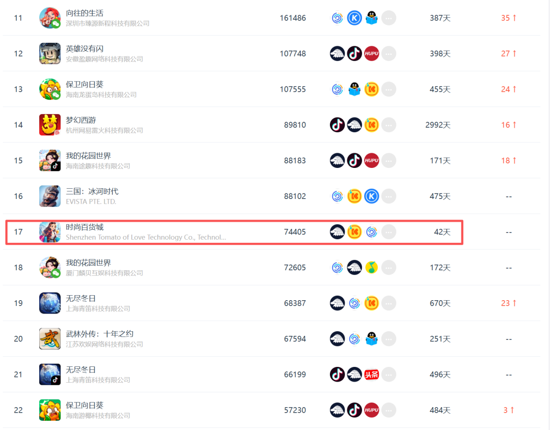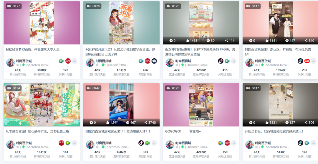 投放素材上,《时尚百货城》当前在投的素材约6.6万组,其中视频素材约1.5万组,其余素材均为图片类素材。