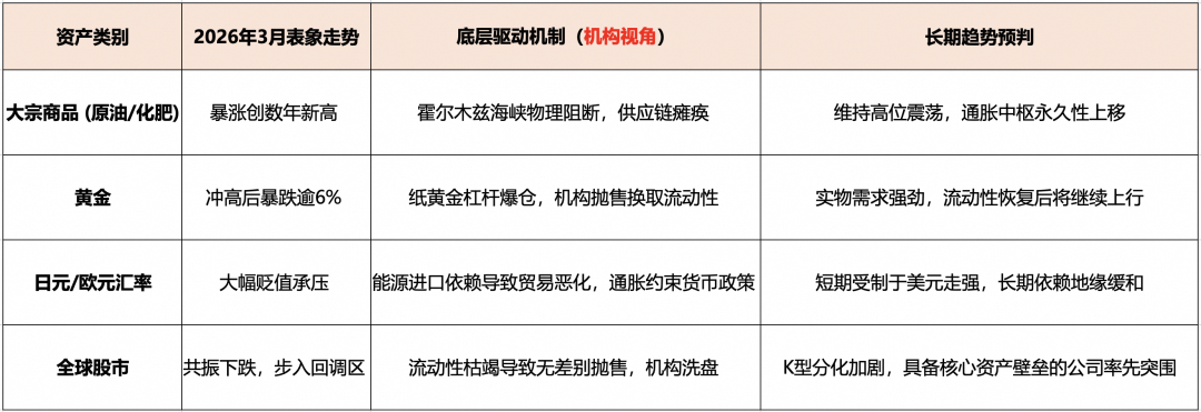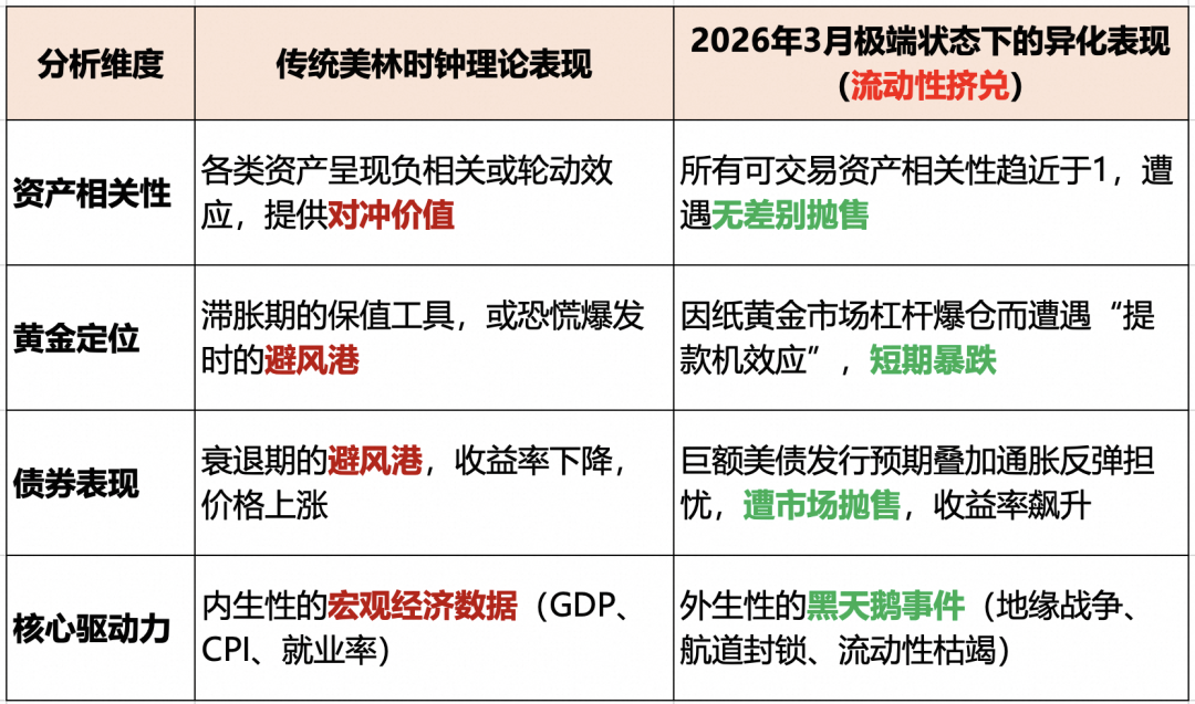然而,当2026年3月的全球金融风暴来袭时,许多人惊呼美林时钟“失效”了。因为在经典框架下,通常不会出现避险资产(黄金、美债)与风险资产(股票)同步暴跌的奇观。这并非美林时钟本身的谬误,而是因为在极端外部干预(如战争爆发与物理供应链骤断)下,市场进入了一个凌驾于经济基本面之上的特殊状态——“流动性挤兑”。