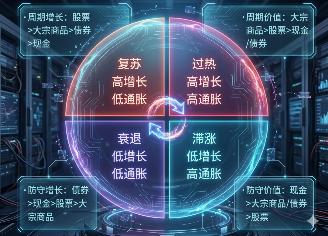 传统的美林时钟根据经济增长(GDP)和通货膨胀(CPI)的高低,将经济周期划分为四个阶段:复苏期(高增长、低通胀,股票为王)、过热期(高增长、高通胀,大宗商品为王)、滞胀期(低增长、高通胀,现金为王)、衰退期(低增长、低通胀,债券为王)。