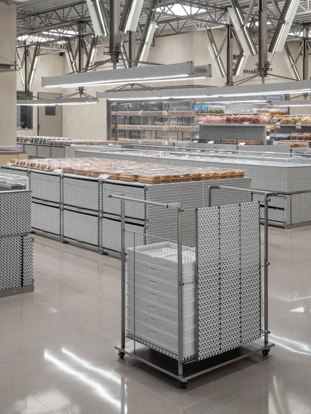 调整后的整个门店,采用全开放、全透明的可视化设计,开阔通透;冷藏柜和网格货架紧密摆放,回型动线流畅自然。