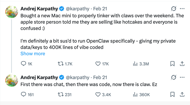 “买了台新Mac mini,准备周末折腾OpenClaw。苹果店员告诉我这东西卖疯了,大家都很困惑。”