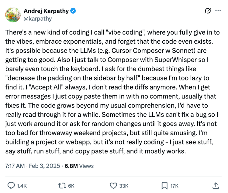 2025年2月,他发了一条推文,说有一种新的编程方式叫“vibe coding”——氛围编程。你完全沉浸在氛围里,甚至忘记代码的存在。他用第一人称描述了自己的状态:“我不再敲键盘了,我用语音跟AI对话。我提非常随意的请求,比如‘把侧边栏的padding减半’。我懒得看diff,直接‘接受全部’。遇到报错,我就把错误信息复制粘贴给AI,不加任何注释,通常就能修好。”