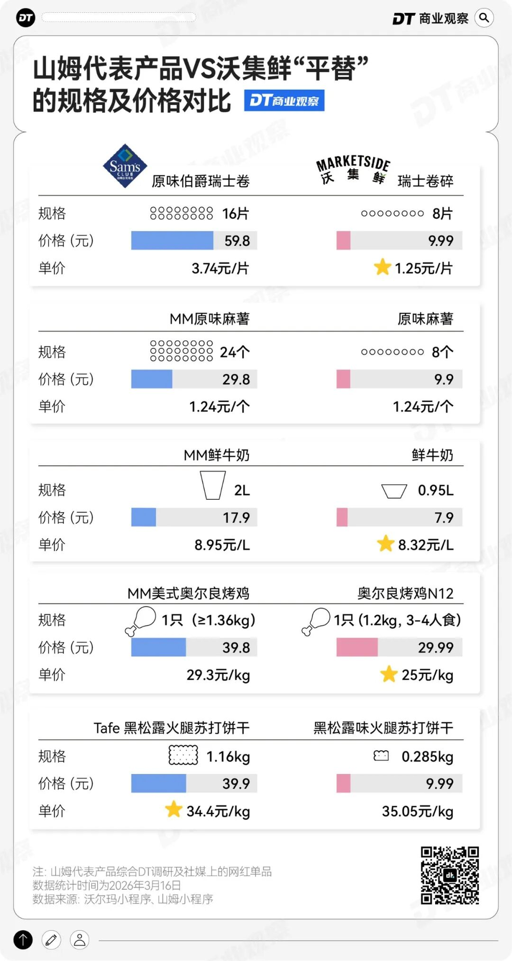 数据显示,除了黑松露火腿苏打饼干在克单价上略微贵一丢丢,原味麻薯价格一致,沃集鲜其他三款产品都明显更便宜。不仅如此,因为分量更小,沃集鲜的总价更低,这就更给人营造出“便宜”的感觉。