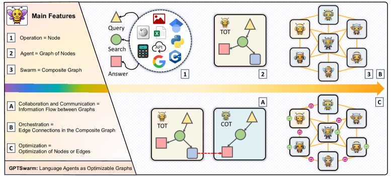 诸葛鸣晨:GPTSwarm的核心想法很直接,就是用图来统一建模single agent和multi-agent system。在这个框架里,节点代表工具、函数或能力,边代表它们之间的连接关系与信息流动方式。这样一来,智能体的构建与优化就可以被统一理解为一个图优化问题:优化节点,是提升单个能力;优化边,是改善协作关系。进一步地,多个agent之间的信息传递,也可以表示为图中的跨节点连接。