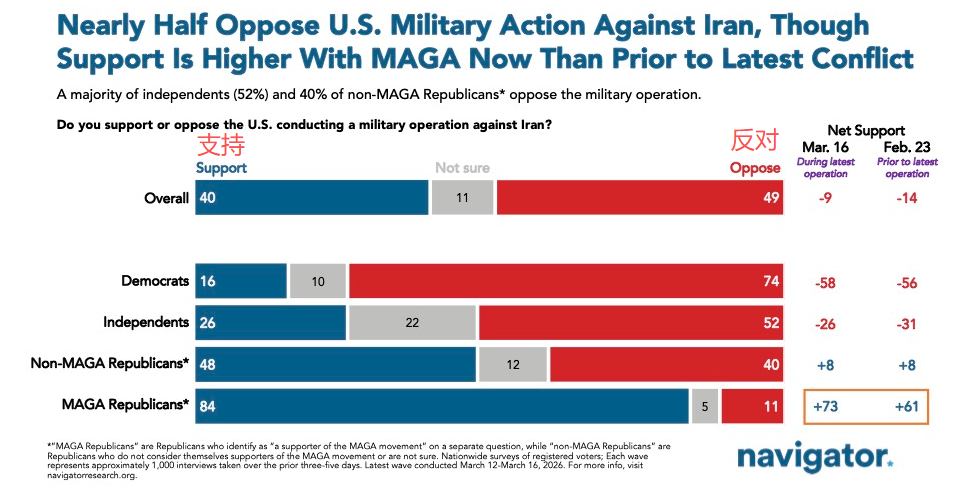 赵穗生:真正支持他的人其实不多。他的基本盘是那些对世界事务、对美国国力不太了解的人,比如“铁锈带”的蓝领、还有农民。在政界,他的那些死党,其实很多人内心里也不同意他。所以现在特朗普处在一个非常孤立的地位,这场战争真正支持他的人很少,民调已经反映出来了。