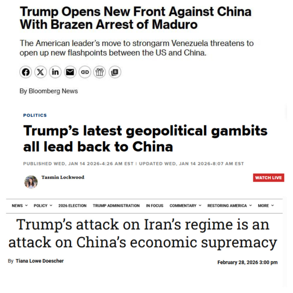 观察者网:您以前也提过,美国国内存在一种对“中国威胁”的过度夸大。有一种言论认为,特朗普打这场仗——先去拉美把马杜罗“绑架”了,再去中东打伊朗——背后目标是为了破坏中国在拉美和中东的利益。您觉得这次美国军事行动的目的是为了针对中国吗?或者,是不是对“中国威胁”过度夸大与对“伊朗军事威胁”臆测过度膨胀二者结合的结果?