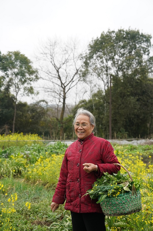 如今,70岁的肖大妹不再需要靠耕作养活家庭,但劳动已经成为她的生活方式。离家不过几百米处,肖大妹有一块小田地,每天她都会来打理、照料。这块田里种植的作物有点随心所欲,都是肖大妹和王坪喜欢的。初春,田里有一半种了麦子。但这么几垄,收获的麦子似乎也吃不了几顿。别人跟她开玩笑:“你看见鬼了?(麦子)种出来喂鸟?”肖大妹回答:“你没吃过纯麦的包子和馒头,那才真正叫麦香呢。”一家人早餐时常吃的粑粑,也是用那块田里种出来的䅟子做的。2月中旬,田里种着豌豆、芦笋、菠菜、生菜、当地特产的菜薹,还有肖大妹从别处找来、种下的蒲公英和黄精等,研究养生也是她的嗜好。茶花和梅花则是王坪种的。