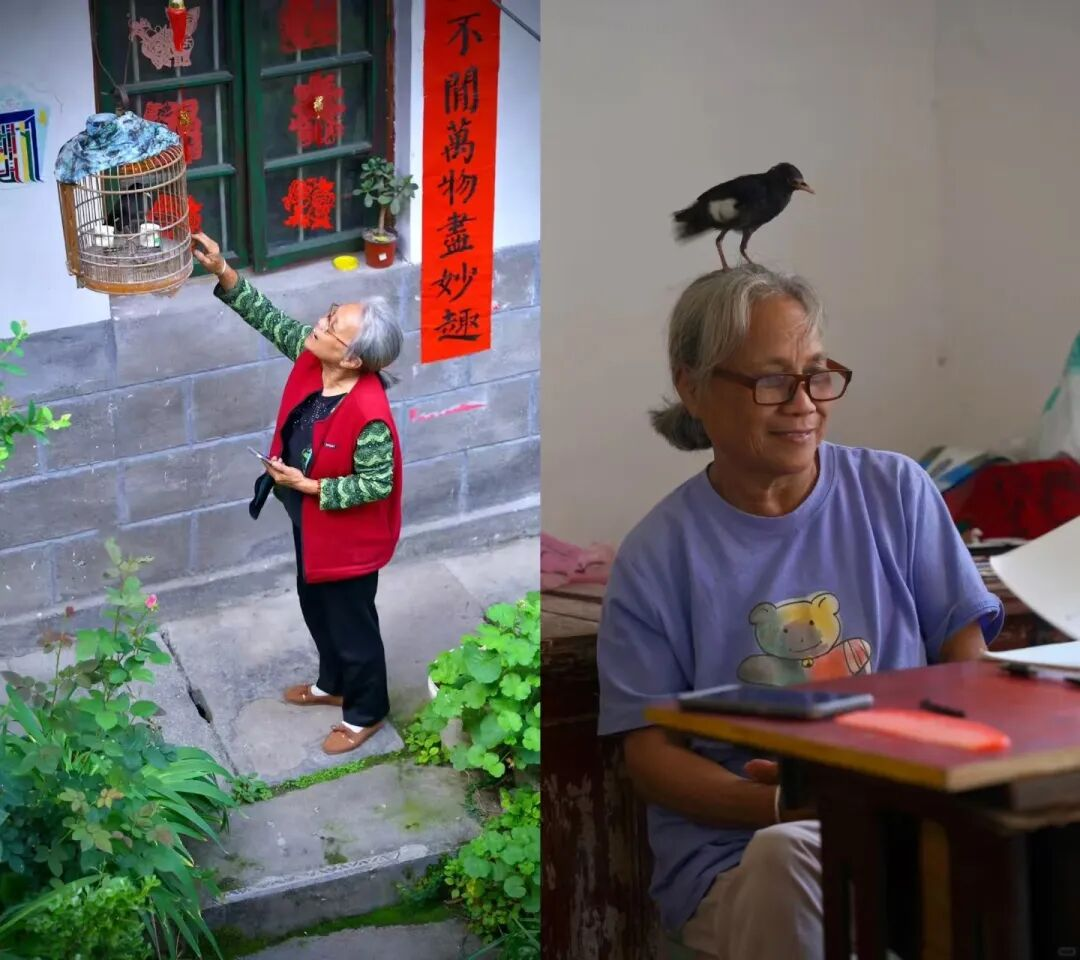 金银花藤蔓从二楼的小阳台往下蔓延,门前有一株杜鹃,还有一棵比人还高的野灌木——是王坪从别处带来的种子,但她也不知道到底是什么植物,长出来了,就随它自己长着。屋檐下挂着名叫“家旺”的八哥的鸟笼。家旺是女儿送给妈妈的宠物。