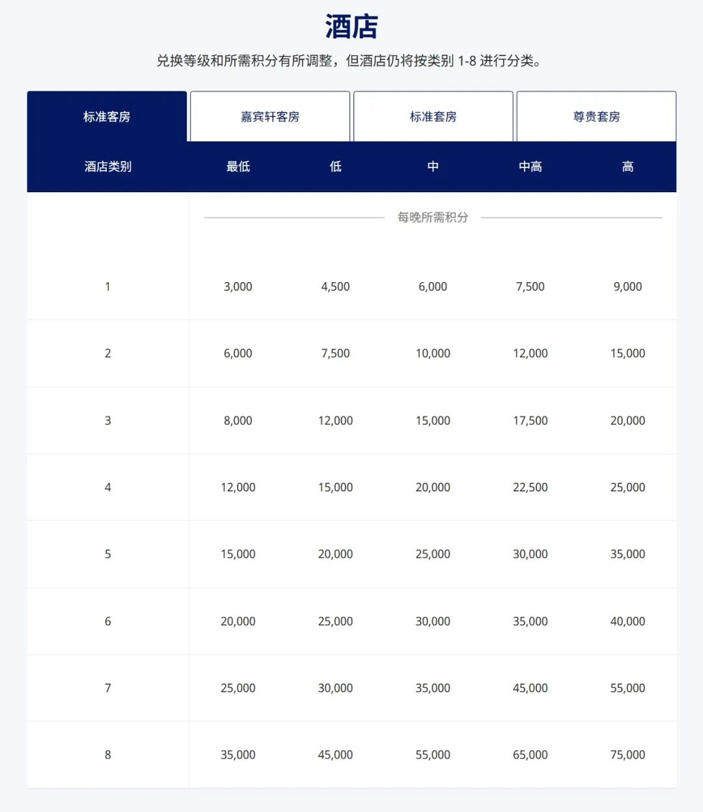 而且普通用户最常兑换的“标准房”。这类房型在新体系下,大多被归入了“中”档,积分全面上调了17%到37.5%。