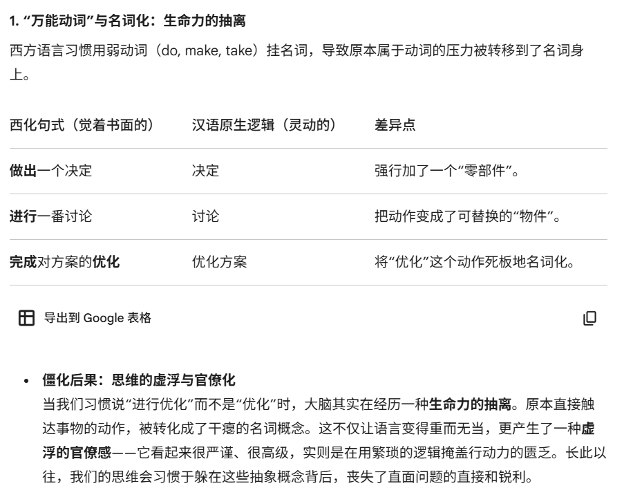 事实上我一开始甚至没有意识到这个问题,直到我和AI讨论这个问题,它抛出了两个句式表达“在很大程度上”、“做出一个……的决定”——我潜意识里早已把它们当成了正常的中文表达,而AI点醒了我:这种逻辑其实是英语的骨架披着汉字的皮,中文里分明有“多半”、“往往”和直接的“决定”,为什么要绕弯子呢?