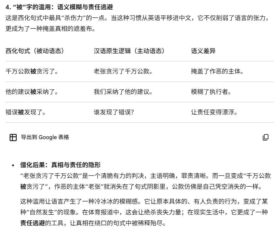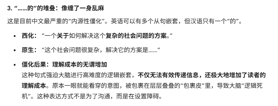 这才是最令我脊背发凉的地方:这种僵化正在钝化我们的审美,更在透支我们的认知。这种翻译腔实际上在为写作者提供一种廉价的避风港。写作者通过堆砌复杂的长定语和被动语态,把简单甚至荒谬的逻辑包装成某种“严谨专业”的假象;而读者在被迫处理这些层层嵌套的句式时,大脑承受着剧烈的认知损耗。