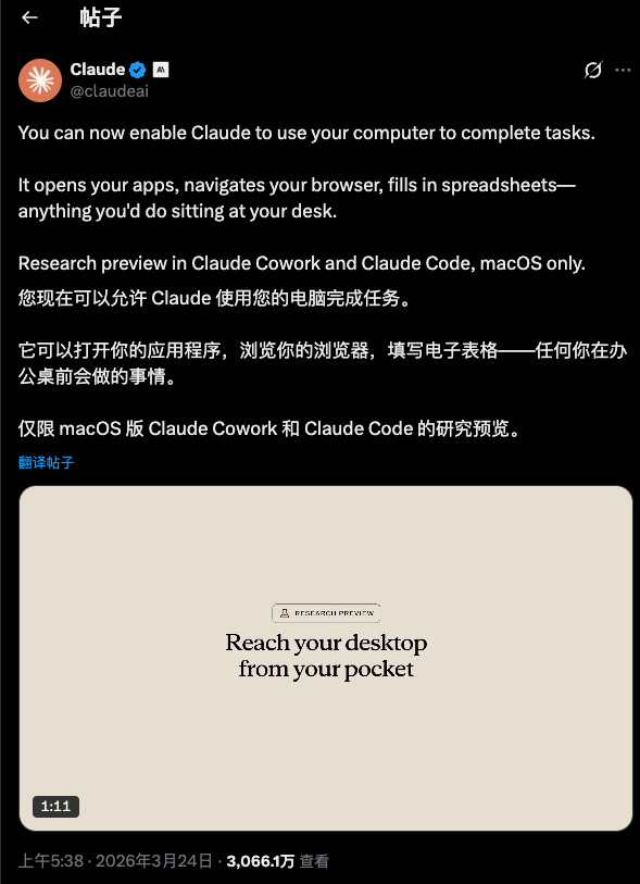 这个新发布被称为Dispatch,借助手机调令Claude控制电脑。更有意思的地方在于,Dispatch回答了一个最近被AI圈反复讨论的问题:在AI Agent的时代,我们还需要App吗?