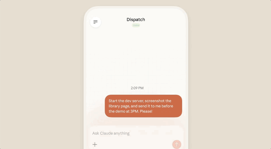 Dispatch目前处于“研究预览”阶段,仅对Max订阅用户开放(月费100美元起)以及macOS系统。Windows和Linux版本在紧锣密鼓筹备中。它的产品形态非常明确:一条从手机到桌面的持久线程。你在手机上启动任务,Claude在桌面端执行,结果回传到手机。全程跨设备同步,对话不会中断。