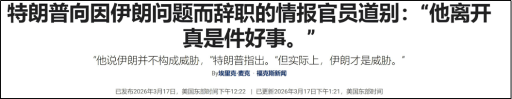 特朗普一听,什么情况,咱俩好像不是很熟;其次你很软弱;而且伊朗是威胁的证据一直都有。所以这位不称职的下属离开是好事。