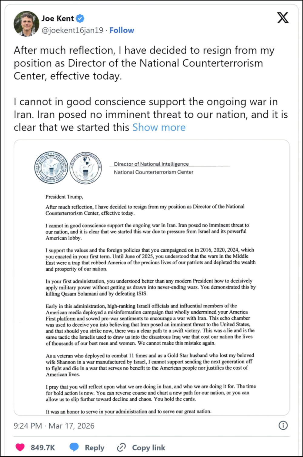 美国国家反恐中心主任乔·肯特,曾是特朗普铁杆粉丝,现在他变了。