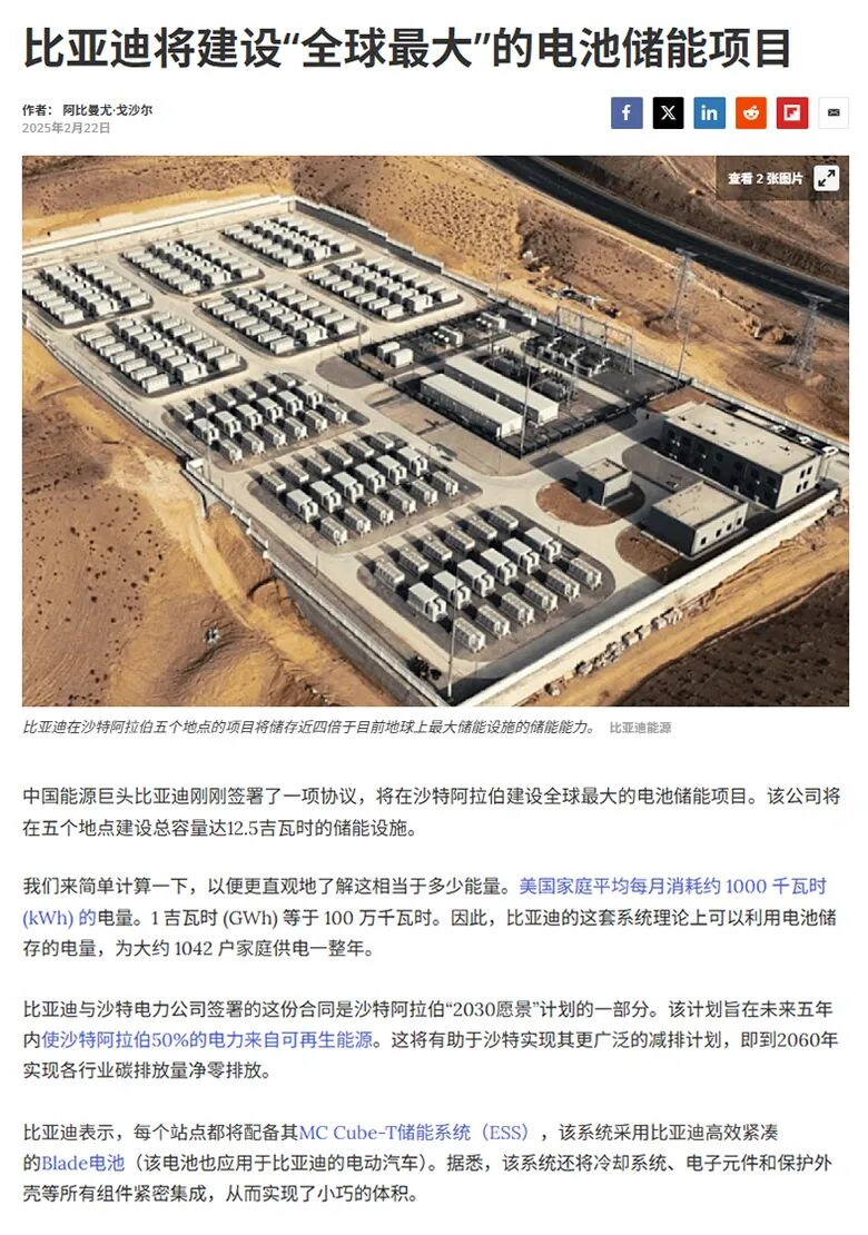 今年2月,比亚迪跟沙特签了一个大单,成为了全球最大的电网侧储能项目合同,储能容量高达12.5GWh。这是什么概念呢?比亚迪24年全年储能电池出货量是27GWh,直接小半年的量就干下去了。