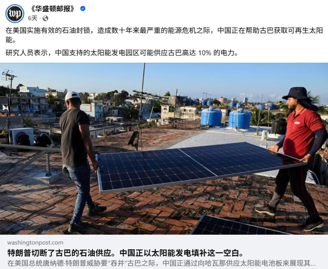 中国确实在古巴大举援建光伏电站:也确实缓解了古巴的白天用电压力,甚至在一年之内让古巴太阳能占比从5.8%提升到20%以上。