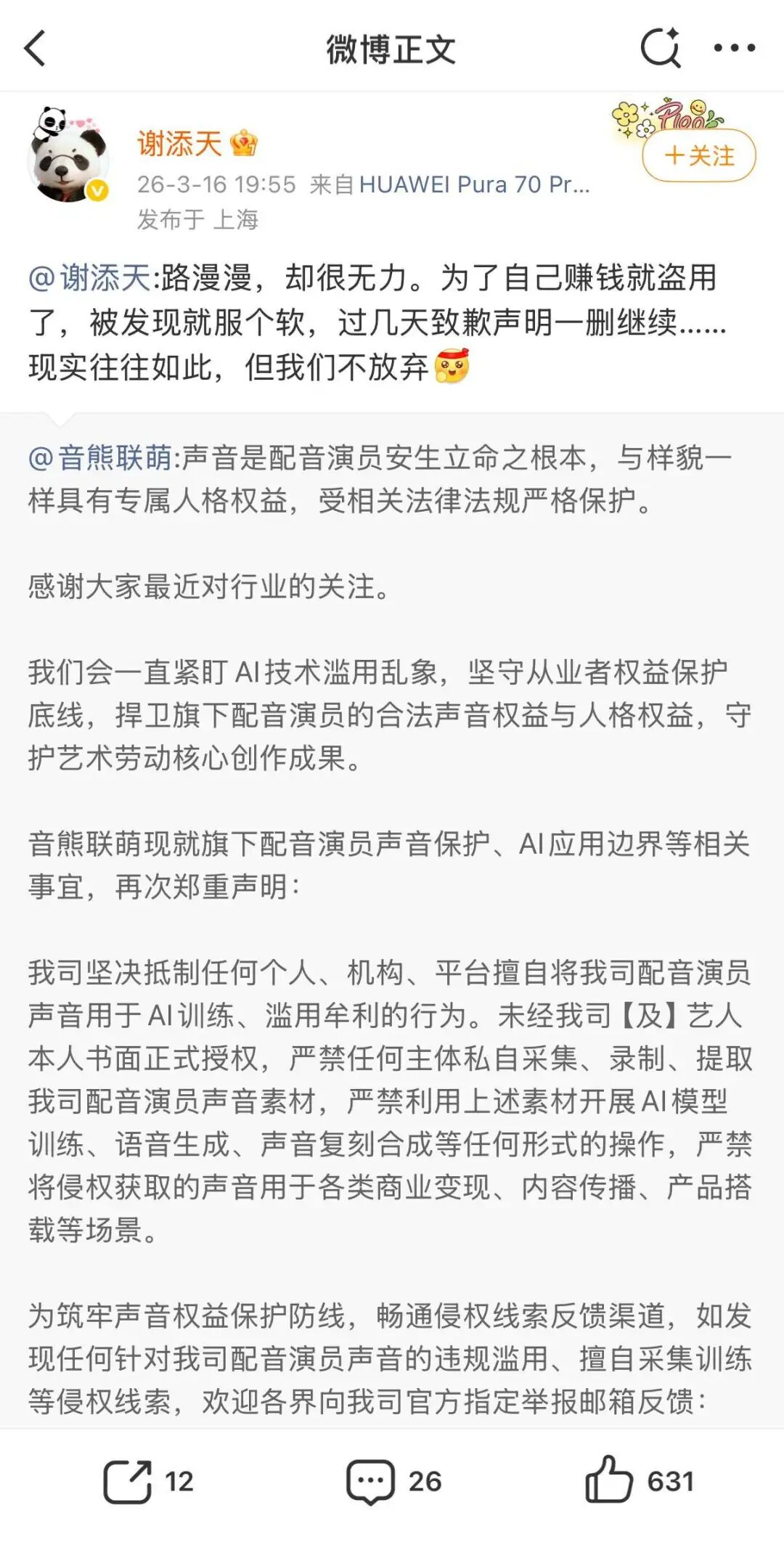 而配音演员谢添天的一条评论,更是戳中了维权的现实痛点:“路漫漫,却很无力,为了自己赚钱就盗用了,被发现就服个软,过几天致歉声明一删继续,现实往往如此,但我们并不放弃。”