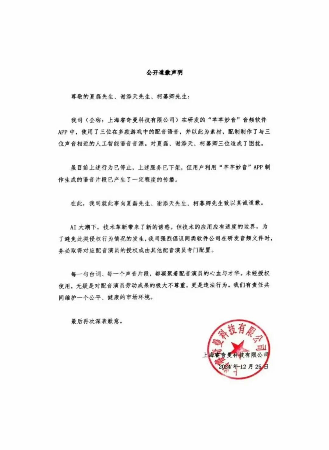 三位配音演员发现声音被盗用后立即展开维权,这场维权之路整整持续了半年,直到2024年12月,才以“芊芊妙音”下架相关音源、公开道歉告终。
