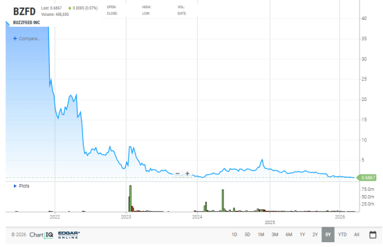 先说结果:截至2026年3月,BuzzFeed市值从巅峰期的17亿美元,惨烈缩水至仅剩2600万美元左右,跌幅超过98%。
