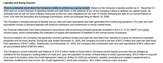 在2025年财报中,公司正式发出“持续经营重大疑虑”警告:“如果没有战略选项,我们预计未来12个月内将没有足够资源履行现金义务。”