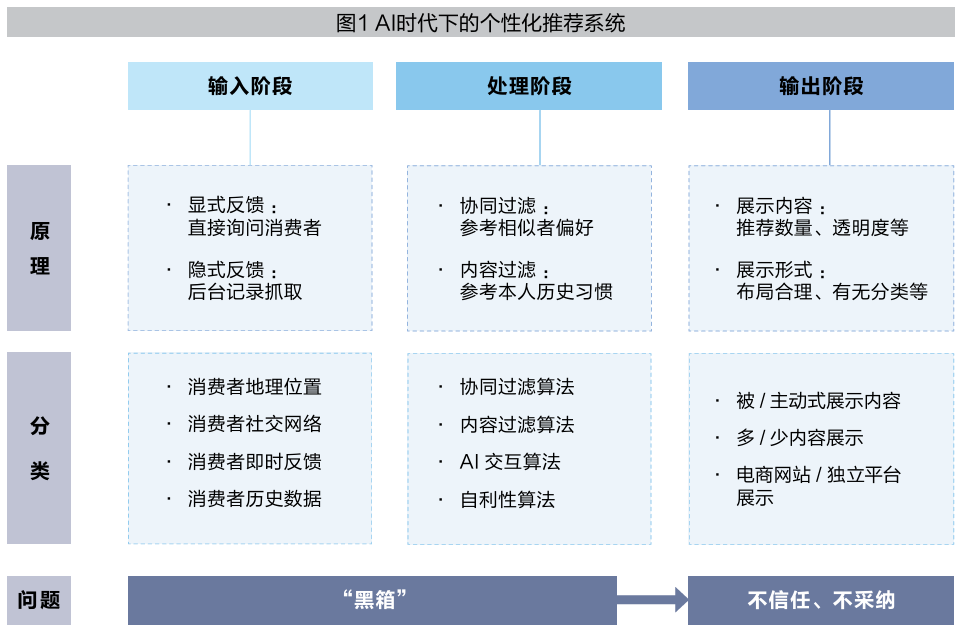 在“输出”阶段,推荐系统把生成的内容推送给目标消费者。不同的个性化推荐系统会通过不同的方式将内容呈现给消费者。一些推荐系统会根据消费者的请求提供推荐,如淘宝的搜索功能会在消费者给出关键词后,根据关键词与历史数据生成个性化搜索结果;另一些推荐系统在消费者直接提出请求前便会基于消费者购买历史和决策过程主动提供建议,如QQ音乐的“每日电台”等。不同推荐系统在内容展示的数量方面也存在差异:有些推荐系统展示少量产品选项,有些则提供长长的产品清单。后者虽能让消费者接触并考虑更多商品,但推荐系统旨在帮助消费者决策并应对信息过载,如此详尽的清单反而可能增加决策难度。有的推荐系统直接嵌入零售商网站(如Walmart.com),便于消费者一站式获取商品;有的推荐系统则是通过第三方独立平台(如大众点评)展示产品推荐。“输出”是消费者能直接看到的,然而前两个阶段的“黑箱”特点可能会导致消费者对个性化推荐系统推荐的内容不信任,进而不采纳。