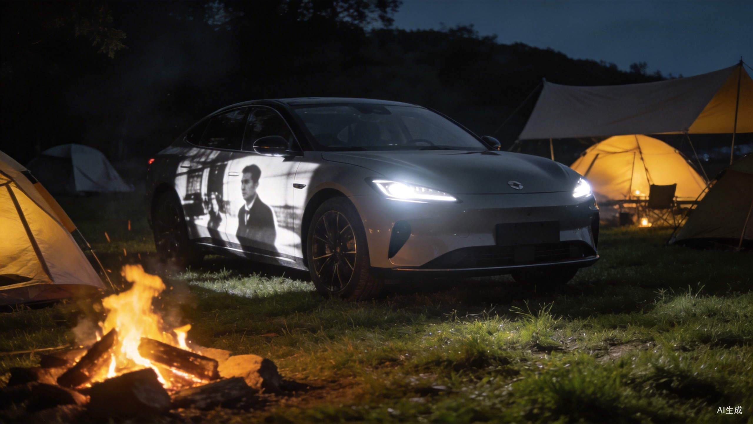 夜幕降临,成都周边的露营地里,一辆新能源汽车正静静地停在草坪上。车主没有支起幕布,也没有拿出便携式投影仪。他只是在车机屏幕上轻点了几下,车头的两颗大灯瞬间射出强光,在对面的一面白墙上,清晰地投射出了一部黑白老电影。