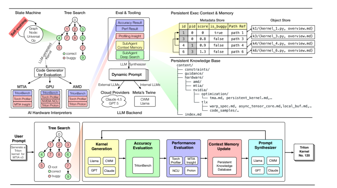 Meta自己搞的MTIA芯片,训练语料里根本没有。KernelEvolve通过知识注入,把硬件特性文档喂给系统,LLM就能生成生产级的MTIA内核。