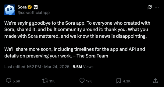 没有挣扎,没有悼词。一条公告直接宣告了Sora的死亡。