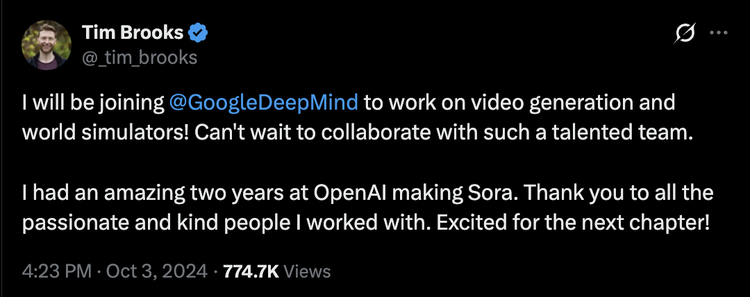 产品没了,但它最有价值的部分,已经进入了别人的身体。Tim Brooks在Google DeepMind会继续做他的研究,物理感知视频生成的方向不会就此终止——只是不再需要用$20/月的消费品价格来证明自己的价值了。