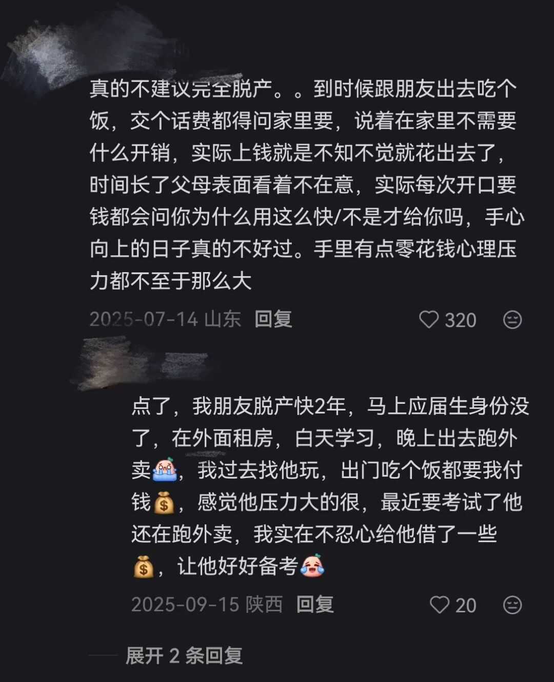 收入的落差最先刺痛他们。李昂本科同学如今多到了“下一个阶段”,有的已买房买车、组建家庭,而他打做兼职一个月到手不过两三千元,连同学聚会都不敢参加,“以前觉得晚几年没什么,直到现在才发现,差距实实在在,焦虑根本藏不住。”