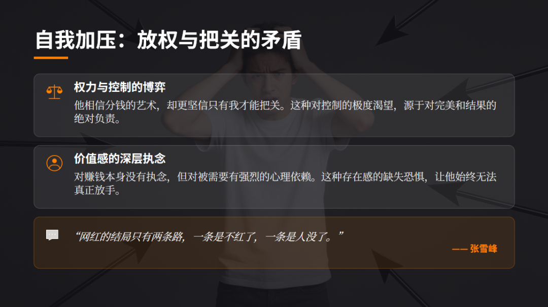 这揭示了一个矛盾:他嘴上说放权,身体却很诚实。他给自己设定的角色是“战略决策者、新业务把关人、内容质检官”——这本身就是三份全职工作。