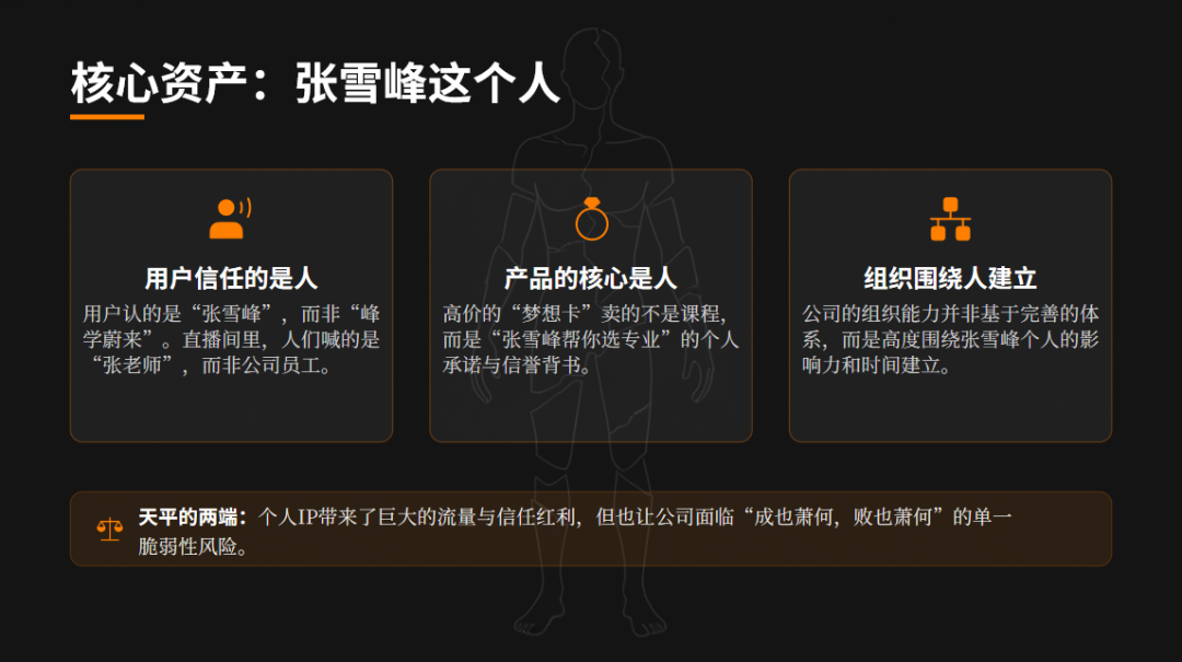 用户认的不是峰学蔚来,是张雪峰。直播间里,人们喊的是张老师,不是峰学蔚来的产品经理。12999元的梦想卡,卖的不是课程,是张雪峰帮你选专业。
