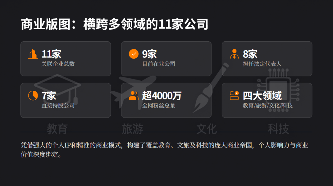 他本人是其中8家的法定代表人,持股7家。全网粉丝超4000万。