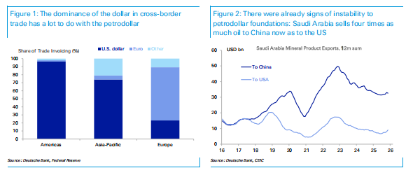 德银指出,若全球脱离跨境油气、转向本土燃料、可再生能源与核电,最直接的长期影响是:欧洲与东北亚油气贸易逆差收窄、中东能源盈余减少;全球石油贸易萎缩,将为非美元贸易定价创造更大空间。脱离石油本身,与推动石油非美元计价的影响同样巨大,石油美元体系的“石油”与“美元”两大支柱将同时承压。