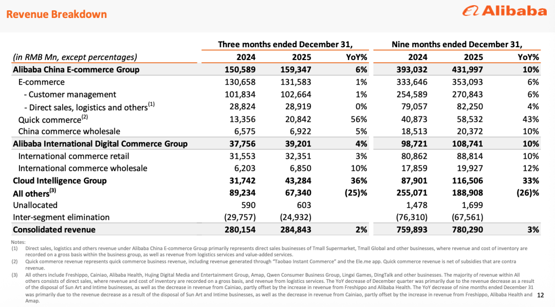 但现实打脸了。根据阿里的财报数据,第三财季(去年四季度)闪购收入同比增长56%,但电商业务收入同比仅增长1%。这实际上说明,阿里在外卖(闪购)上的投入似乎并没有有效推动电商业务增长。