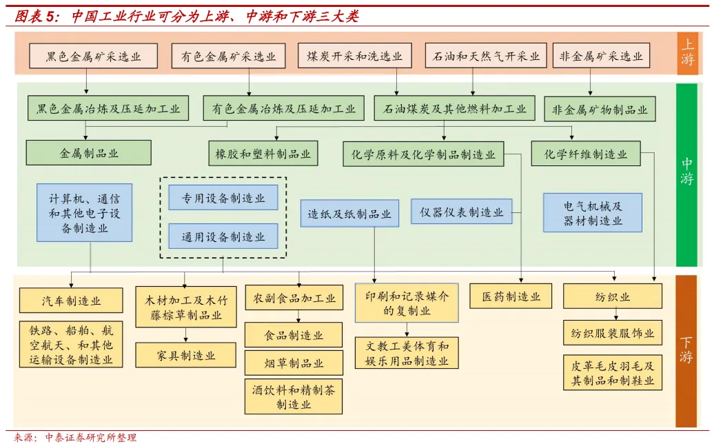 根据在产业链里所处的位置,可将中国的工业行业,分为上游、中游和下游三大类,上游以采掘工业为主,中游包括原材料和中游制造业,下游主要是消费品制造业。产业链之间的关系,如下图所示。