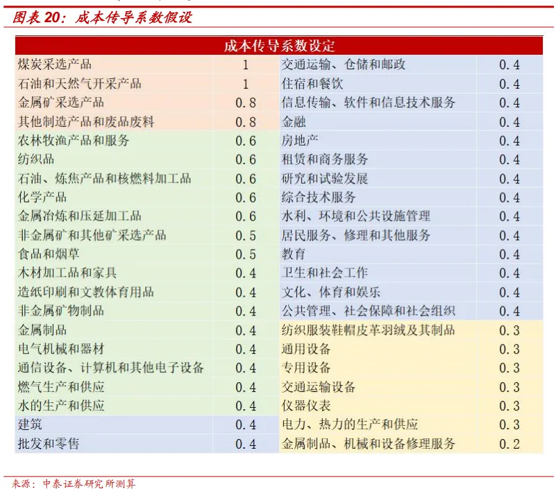 根据经验,上游原材料行业传导能力强,系数设为0.8-1.0,中下游工业行业则分别设定在0.4-0.8之间,服务业相关设为0.4,个别行业据实际情况进行设定。