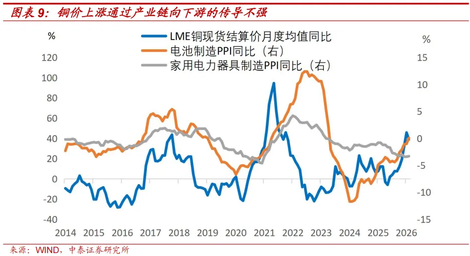 2024年有色金属冶炼和压延加工业的CR5为47.5%,处于中等水平,预计向下游行业(如家电、新能源汽车电池)成本传导的能力,要弱于石油加工和化学纤维业,这也能从PPI中看到。