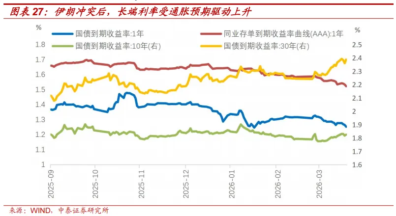 虽然输入性通胀预期对长端利率形成扰动,但债市面临的“资产荒”格局并未改变。一方面,信贷需求偏弱导致高息资产供给收缩;另一方面,保险、理财等机构配置需求刚性。这种供需格局意味着,即便长端利率因短期情绪出现抬升,其上行空间也将受到配置盘的制约。