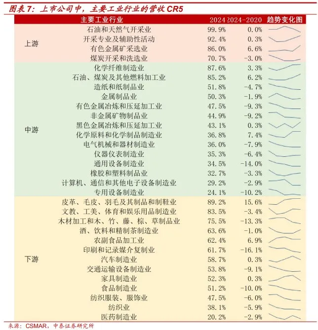 结果显示主要工业行业中,上游行业的市场集中度较高,2024年CR5均高于70%。