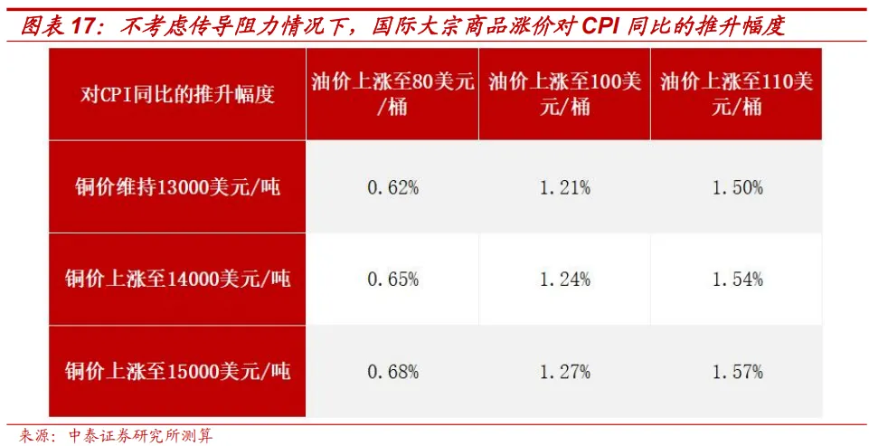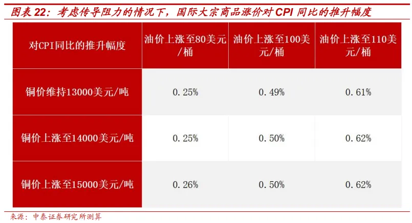 同样地,基于对油价、铜价的价格假设,代入模型计算得到国内各部门的价格涨幅。再乘以行业对应的PPI、CPI权重,进行加总,最终得到国际大宗商品涨价对物价的影响幅度。由于考虑到传导阻力的存在,该测算结果相比于不考虑传导阻力时,可能会更贴近现实情况。