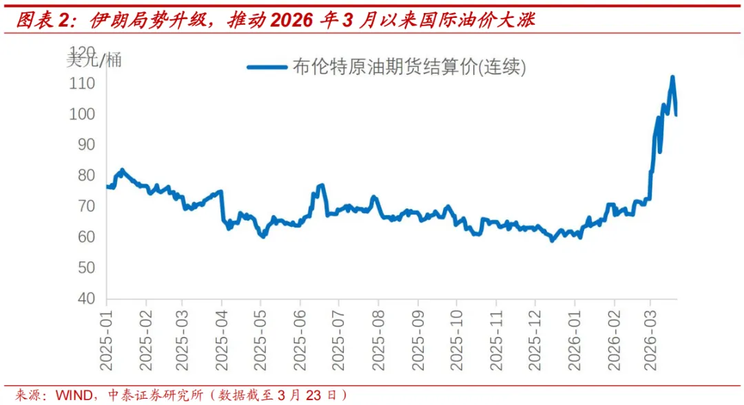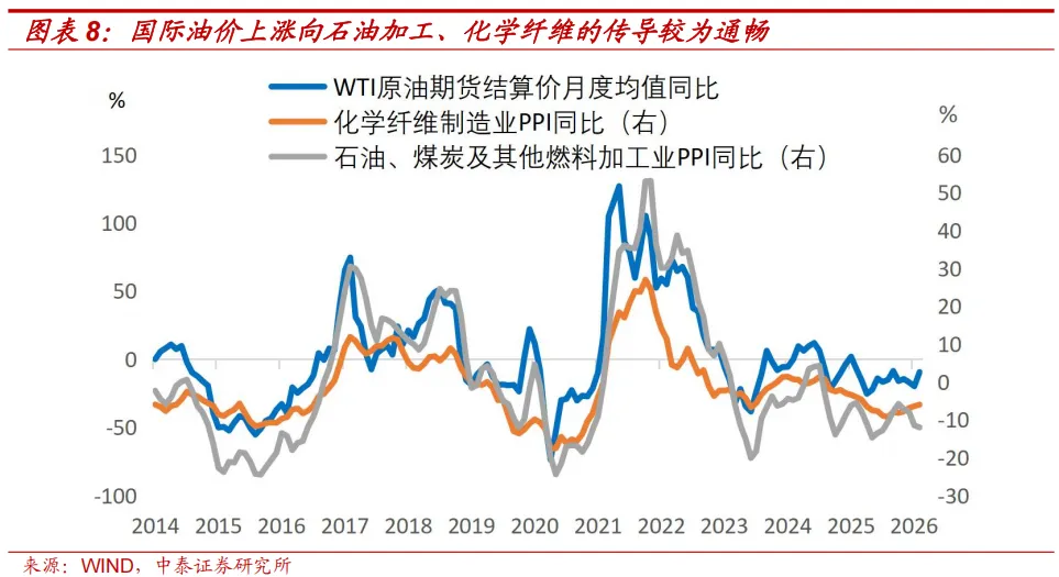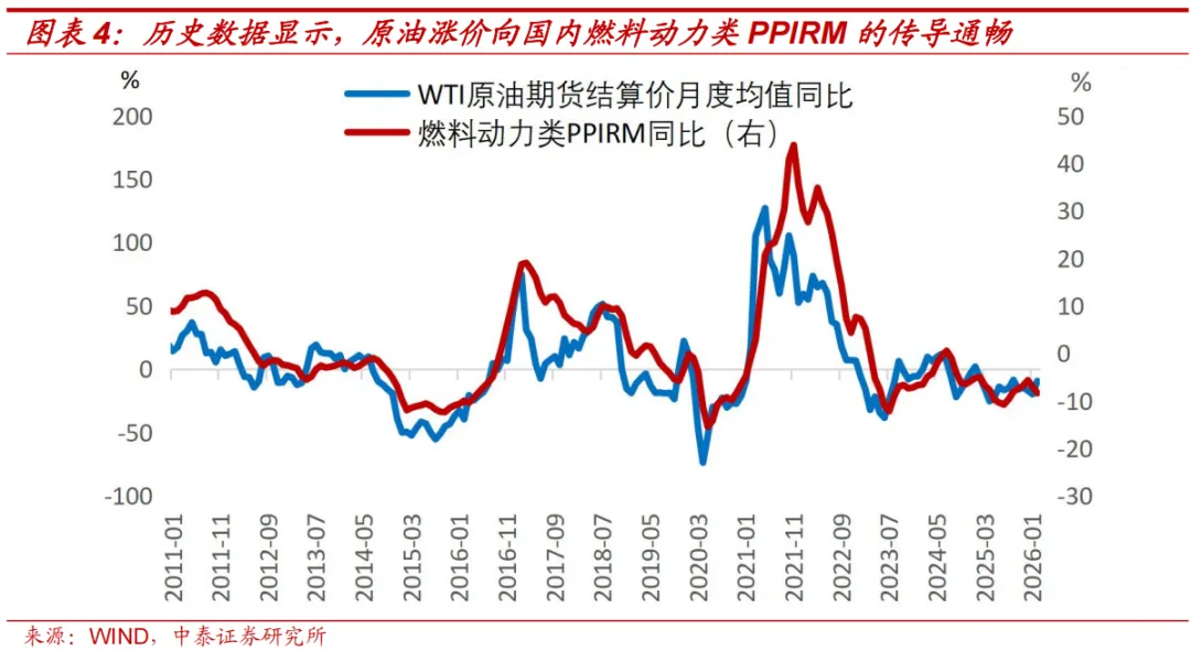 2025年10月到2026年2月,中国PPI环比连续5个月为正,同比也从-2.1%快速回升到-0.9%。伊朗紧张局势推动3月以来国际油价大幅上涨,目前尚未看到缓和迹象。以铜为代表的有色价格也持续高位震荡,向下游消费品传导的迹象越来越明显。市场担心国际定价的大宗商品涨价,会给国内带来输入性通胀风险。
