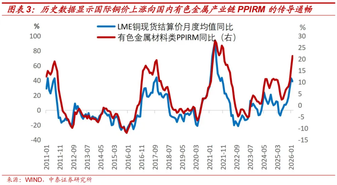 目前国内面临的输入性通胀压力,集中在有色和原油。从历史数据看,这两类大宗商品涨价,向国内原材料价格的传导比较通畅。